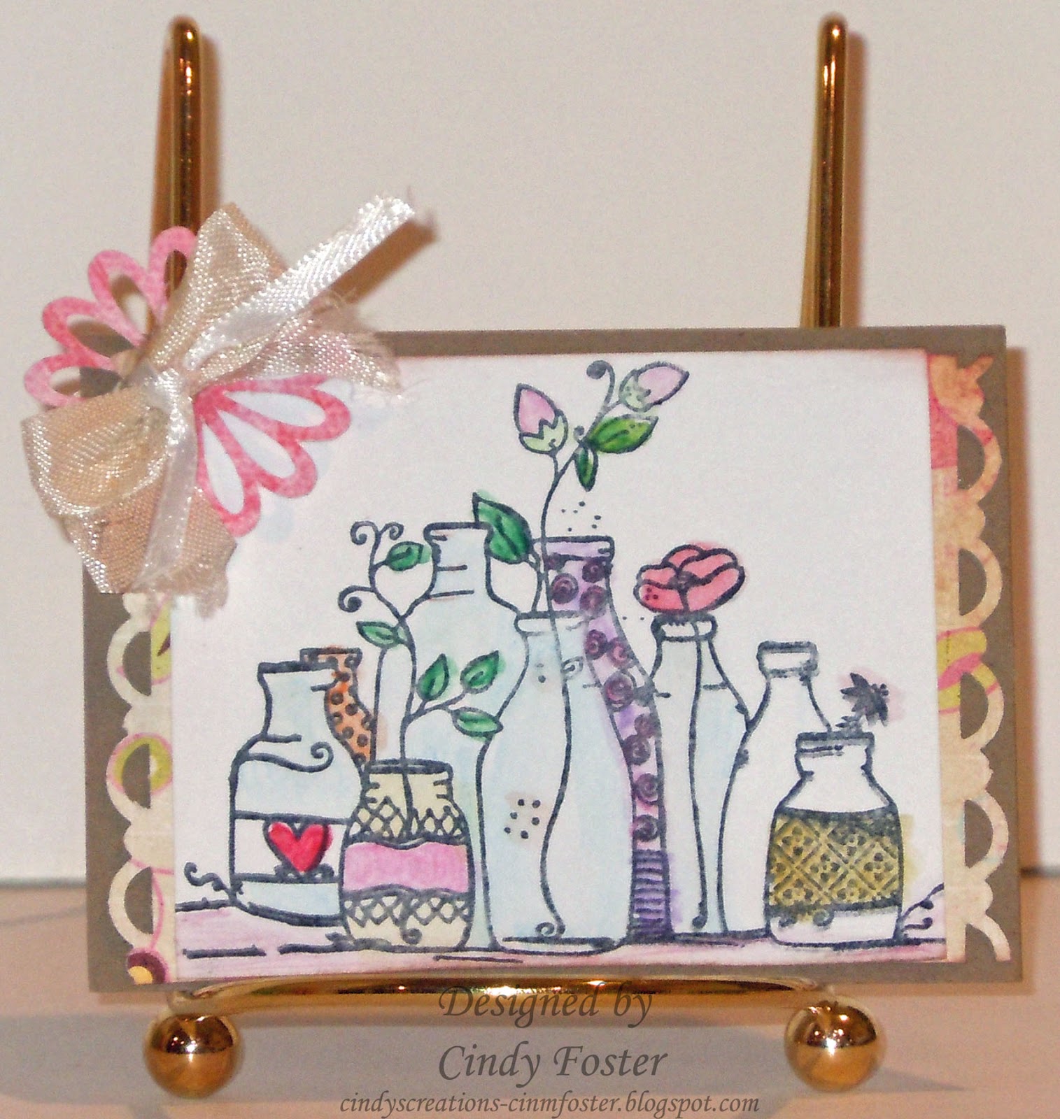 My last ATC for the challenge is bottles and jars of flowers. I use milk jar, drink jars, mustard jars and canning jars to name a few. I take the flowers to work, drop off at a friends house or send with DH to work. The top corner has a Cricut flower with a ribbon bow and each side has a punched edge.