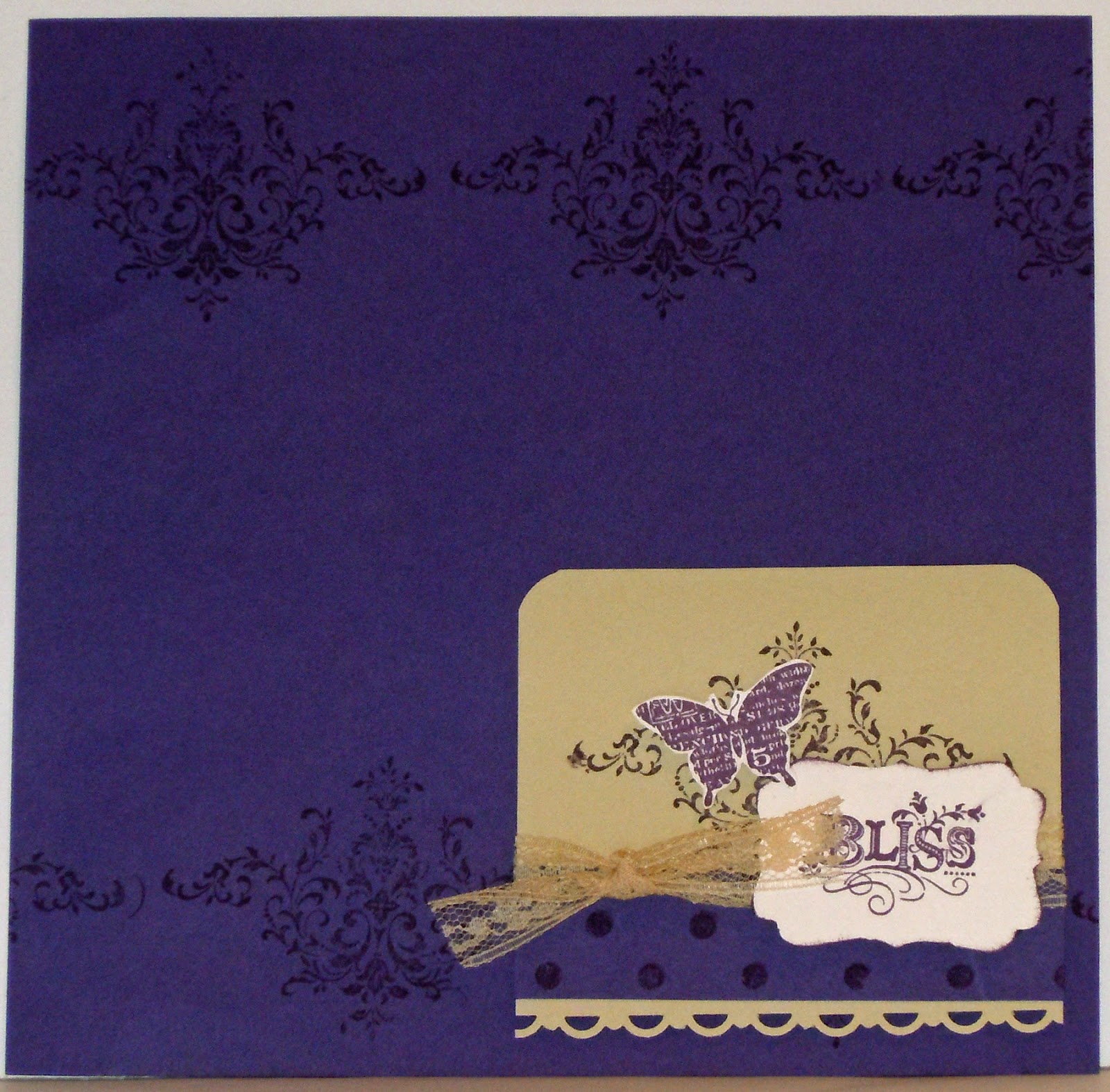 I punched the bottom edge of the tan cardstock then stamped the image again in the center. I made the Polka Dot strip from the same paper as I didn't have a purple pattern paper that would go . "Bliss" is stamped and punched with the decorative label and there are pop up dots behind it and the butterfly. I used foam tape on three two sides of the tan tag so that they could slide photo or journaling behind it.